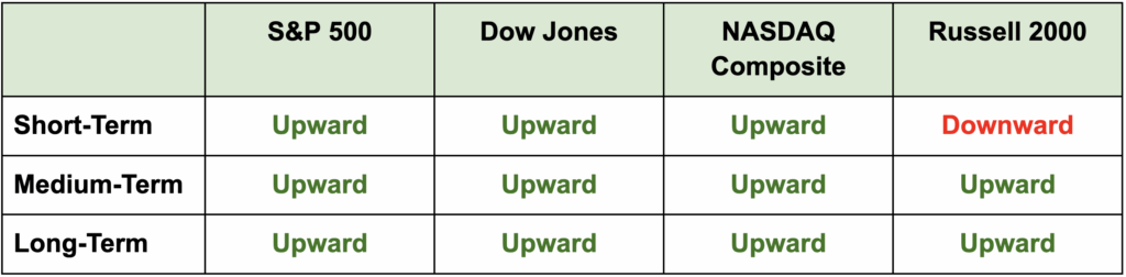 Note: Indexes closed mixed yesterday, with the S&P 500 and Nasdaq rising – powered by Big Tech – while the Dow and the Russell 2000 fell. The short-term direction for the Russell 2000 slipped into downward territory.