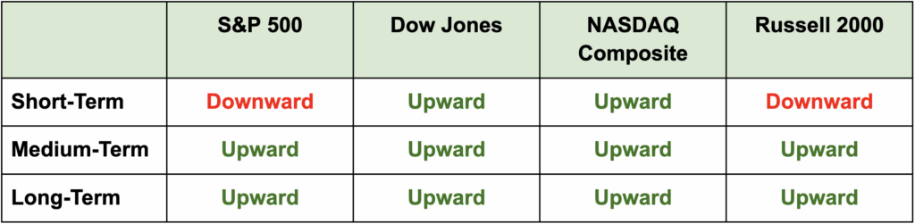 Note: Indexes closed lower yesterday but opened higher this morning. The short-term directions for the S&P 500 and Russell 2000 are back in the red – but barely.