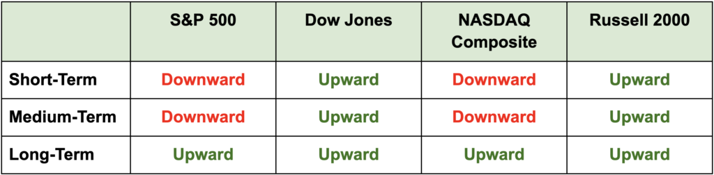 Note: Indexes closed mixed but mostly flat yesterday – sending the short-term directions for the Dow and the Russell 2000 back upward.